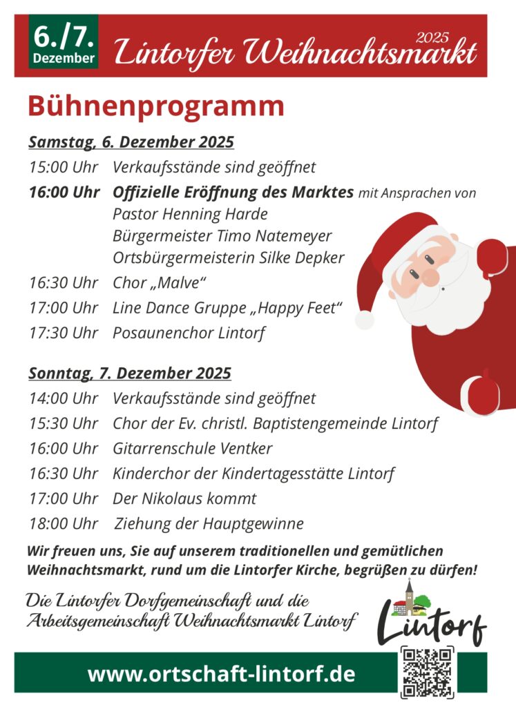 Die offizielle Eröffnung findet am Samstag, 6. Dezember 2025, um 16 Uhr an der Bühne neben dem Kircheingang statt. Nach den Begrüßungen durch Ortsbürgermeisterin Silke Depker sowie Vertreterinnen und Vertreter der Kirchengemeinde und der Gemeinde Bad Essen beginnt das Bühnenprogramm – mit Auftritten des ukrainischen Chors Malve, der Line-Dance-Gruppe Happy Feet und des Posaunenchors Lintorf.