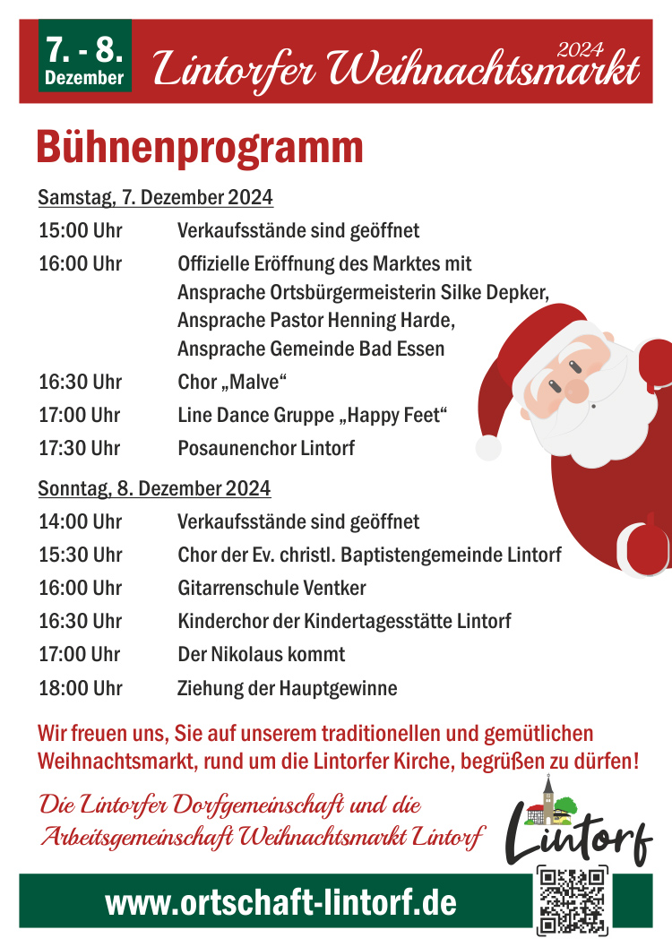 Die Dorfgemeinschaft und das Team der Arbeitsgemeinschaft Weihnachtsmarkt Lintorf freuen sich darauf, viele Besucherinnen und Besucher begrüßen zu dürfen, um gemeinsam die adventliche und weihnachtliche Atmosphäre zu genießen.
