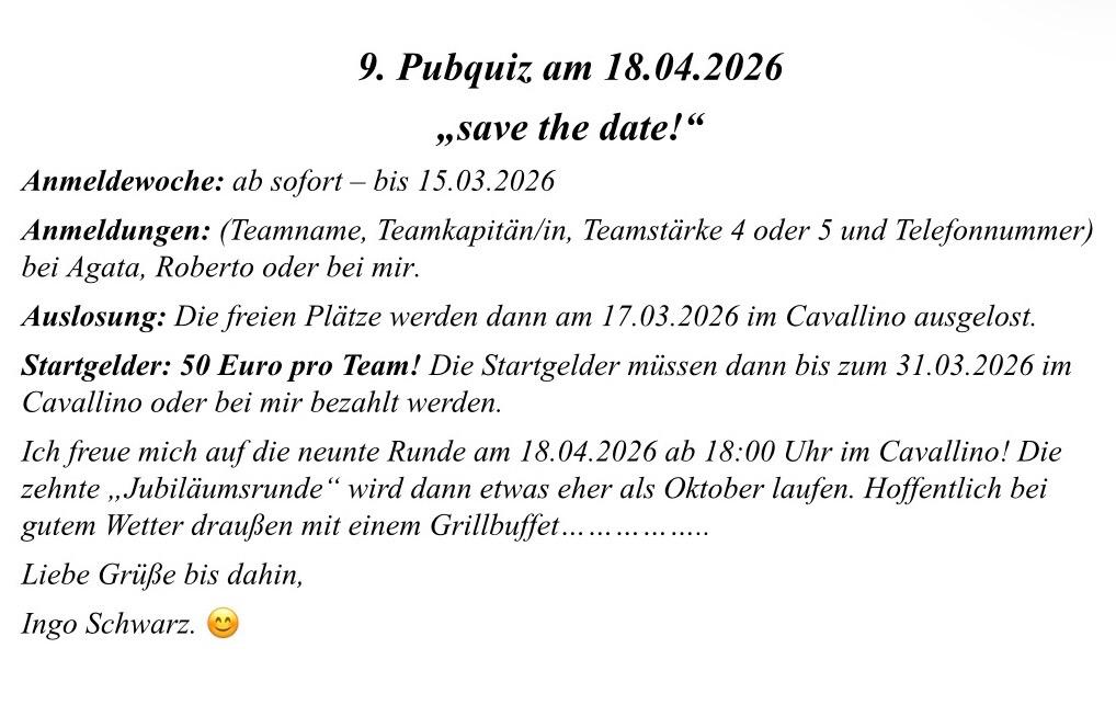Ich freue mich auf die neunte Runde am 18.04.2026 ab 18:00 Uhr im Cavallino! Die zehnte „Jubiläumsrunde” wird dann etwas eher als Oktober laufen. Hoffentlich bei gutem Wetter draußen mit einem Grillbuffet…………………