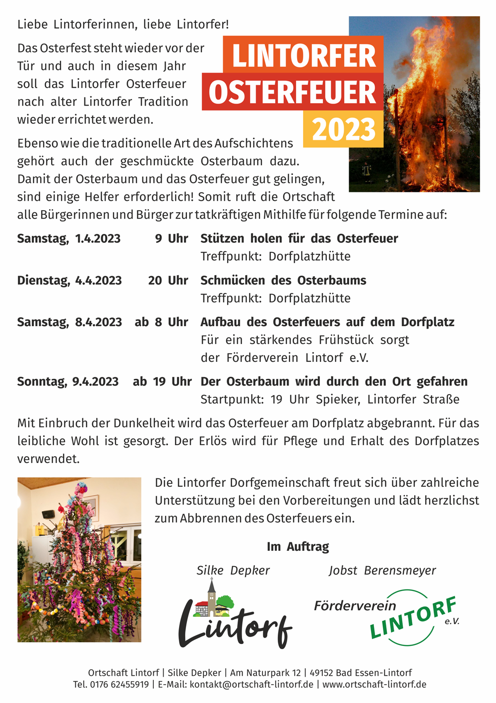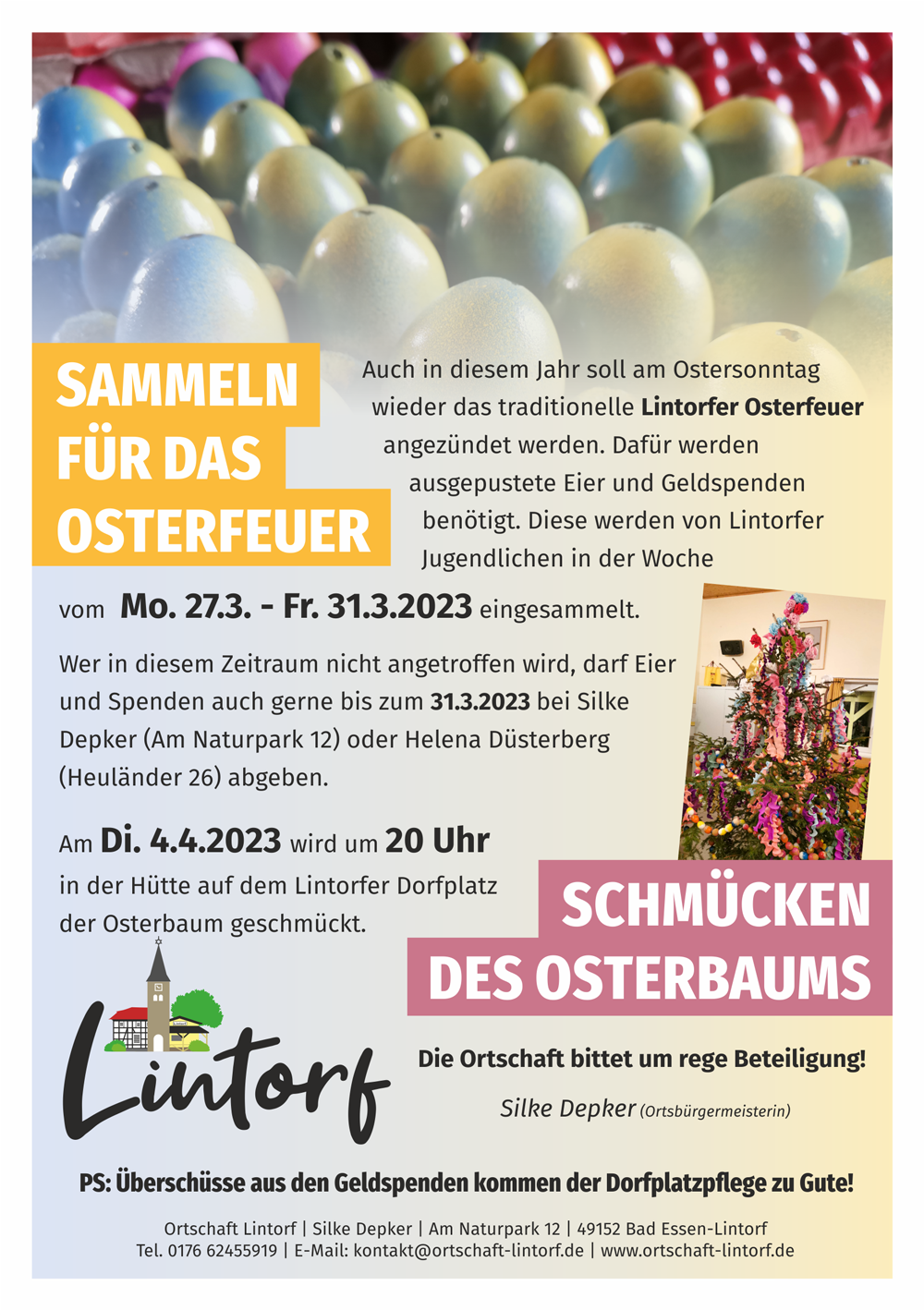 Sammeln für das Osterfeuer Auch in diesem Jahr soll am Ostersonntag wieder das traditionelle Lintorfer Osterfeuer angezündet werden. Dafür werden ausgepustete Eier und Geldspenden benötigt. Diese werden von Lintorfer Jugendlichen in der Woche vom Mo. 27.3. - Fr. 31.3.2023 eingesammelt. Wer in diesem Zeitraum nicht angetroffen wird, darf Eier und Spenden auch gerne bis zum […]