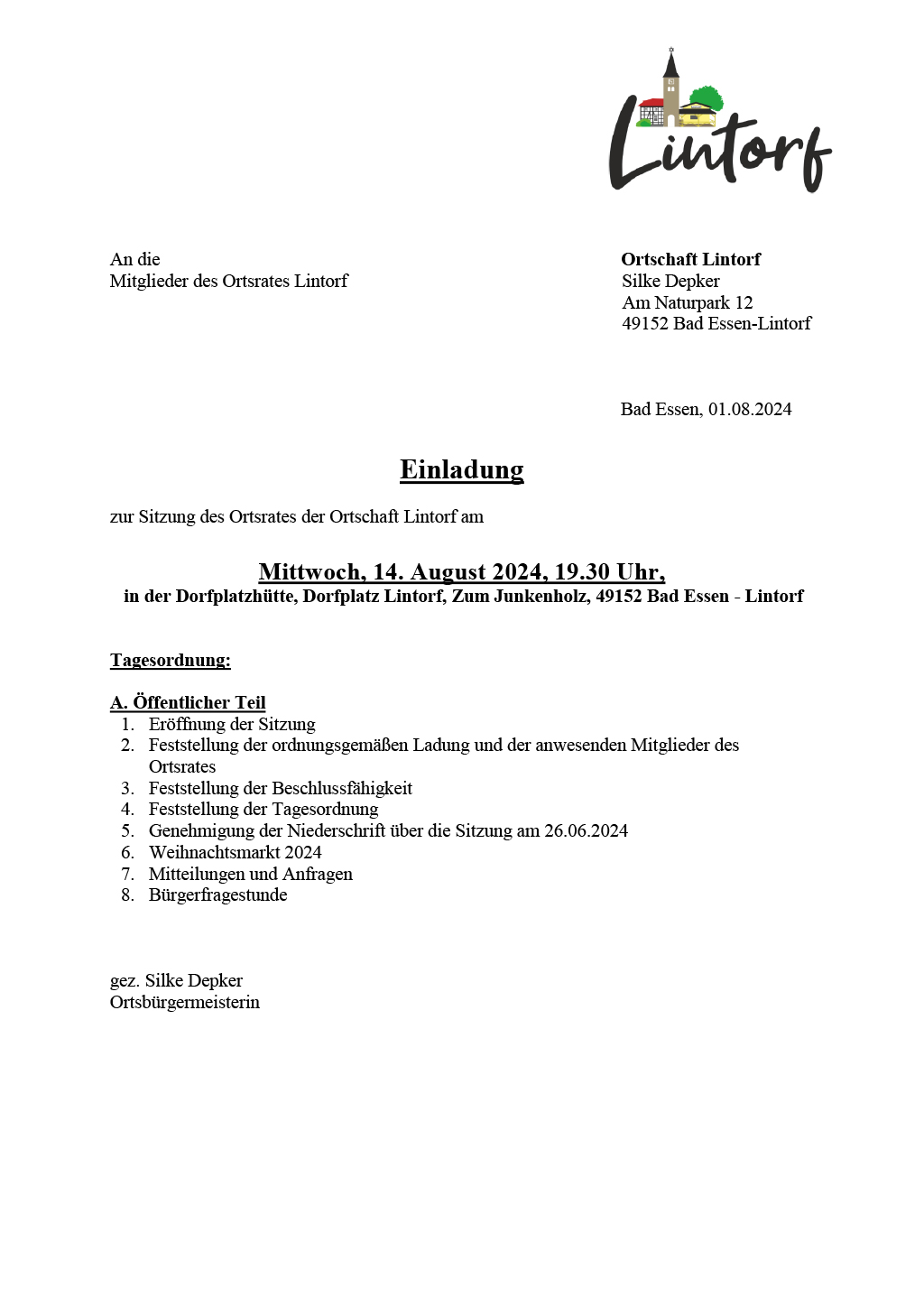 Am Mittwoch, dem 14. August 2024 findet um 19:30 Uhr die dritte Ortsratssitzung in diesem Jahr in der Dorfplatzhütte Lintorf statt. Zuhörerinnen und Zuhörer sind herzlichst eingeladen. Zum Ende der Sitzung wird es eine Bürgerfragestunde geben.