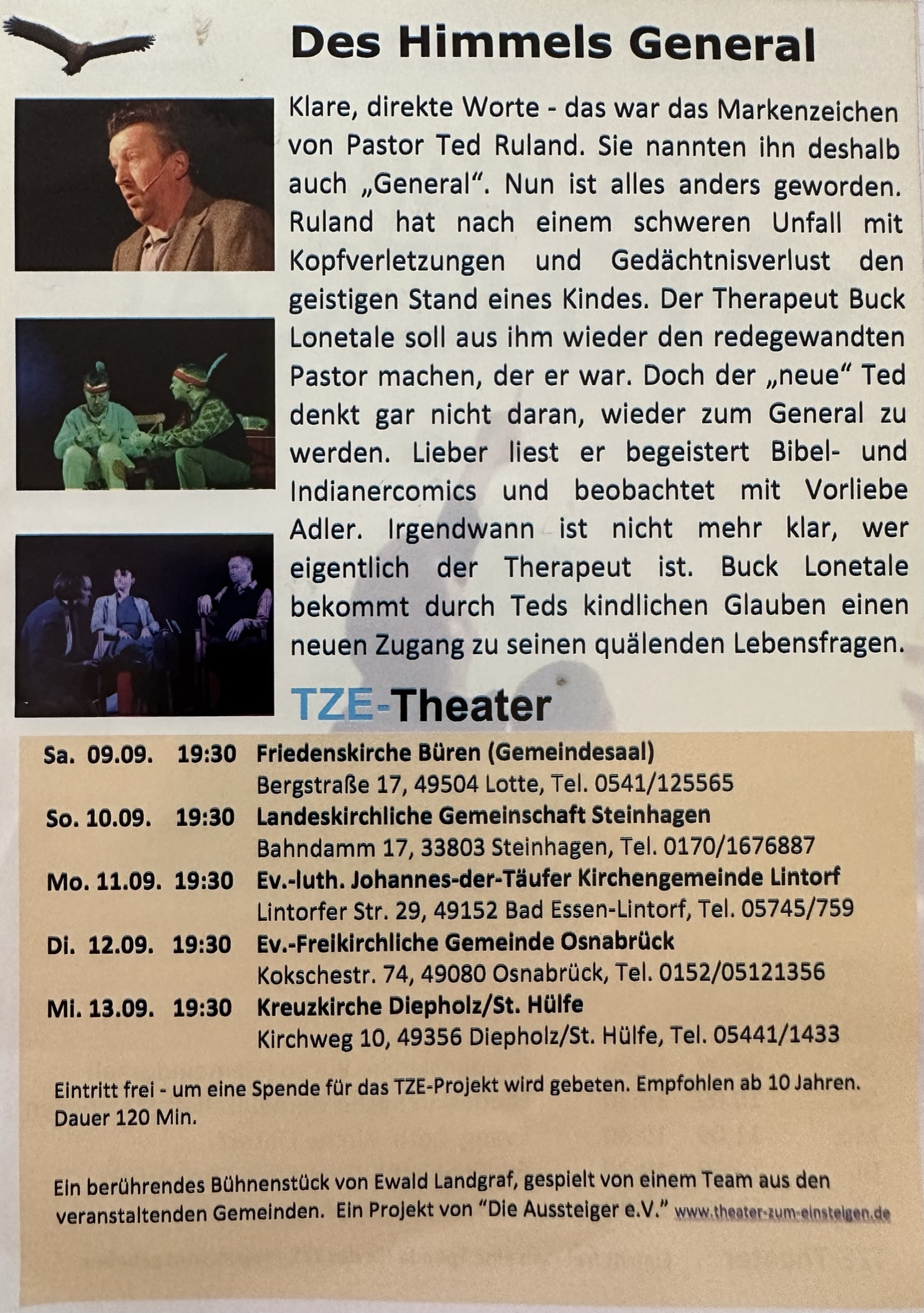 In der Kirche in Lintorf gibt es Theater. Zu Gast in der Johannes-der-Täufer-Kirche ist das TZE-Theater von Ewald Landgraf. Gezeigt wird das neu inszenierte Stück „Des Himmels General“. Gespielt wird das Stück von einer Laienspielgruppe, zusammengestellt aus den Gemeinden Büren, St. Hülfe, Lintorf, Osnabrück und Steinhagen.